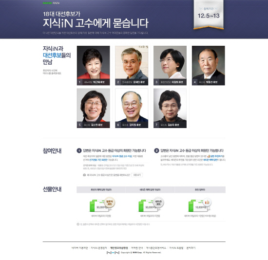 네이버는 18대 대통령 선거 공식 선거운동 기간을 맞아 대선후보가 지식iN 고수들에게 질문을 던지고 답변을 기다리는 '대선후보가 지식iN 고수에게 묻습니다' 특집 페이지(http://kin.naver.com/event/daesun2012.nhn)를 오픈했다고 밝혔다.
