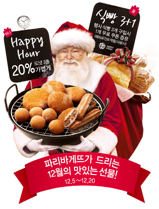 파리바게뜨 관계자는 "크리스마스에 산타클로스가 선물을 주듯이, 올 한해 사랑해주신 고객을 위해 12월은 파리바게뜨가 산타클로스가 되어 선물을 드리고자 이벤트를 준비했다"며, "다양한 이벤트를 통해 파리바게뜨와 함께 행복한 크리스마스가 되시기를 기대한다"고 말했다. 문의: 080-731-2027 / www.paris.co.kr