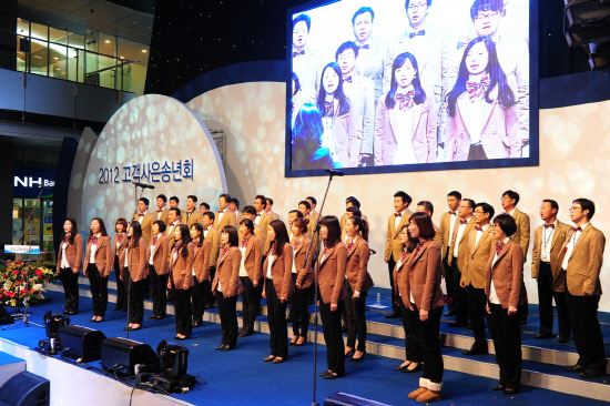 | 포스코는 7일 고객사들을 초청하여 '2012년 고객 사은 송년회'를 개최하고 한마음으로 위기를 극복하자는 메시지를 전달했다. 사진은 축하 공연 중 포스코패밀리와 고객사 임직원들로 구성된 <고래고래 합창단>이 팝송 메들리를 부르는 모습. |