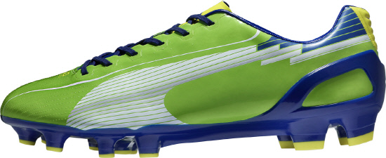 그린-블루의 새로운 시그니처 컬러로 잔디구장에 더욱 잘 어울리는 디자인으로 재탄생 된 푸마의 에보스피드 1FG는 지난 런던 올림픽 당시 김보경 선수가 착용해 유명해진 제품이다. 일체형으로 제작된 페박스(PEBAX) 소재의 아웃솔은 신발의 무게를 비약적으로 줄임과 동시에 필요 이상의 발 뒤틀림을 방지하고 반응력과 안정성을 높여준다. 외부 힐카운터를 최소화 하는 등 기술을 활용하여 무게를 줄였지만 유연성과 반응성은 최대화했다. 매우 부드럽고 얇은 초극세사 소재의 외피는 최적의 착화감과 함께 완벽한 피팅감을 통해 우수한 볼 터치감을 제공하며, 아주 얇은 돌기를 부착해 물기가 있는 상태에서도 공에 대한 접지력을 향상시켜준다. 족형에 상관없이 최적의 착화감을 줄 수 있도록 새로운 푸마의 에보앱토라스트(evoAptoLast)로 설계된 것이 특징.