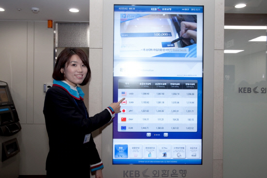 ◇11일 오전 서울 중구 남대문로 서울 스퀘어 빌딩 1층에서 열린 외환은행 『Q' Plex 서울 스퀘어점』개점식에서 소속 영업점 직원이 최첨단 미디어 월(Media Wall)을 통해 다양한 금융상품 정보를 확인하고 있다.