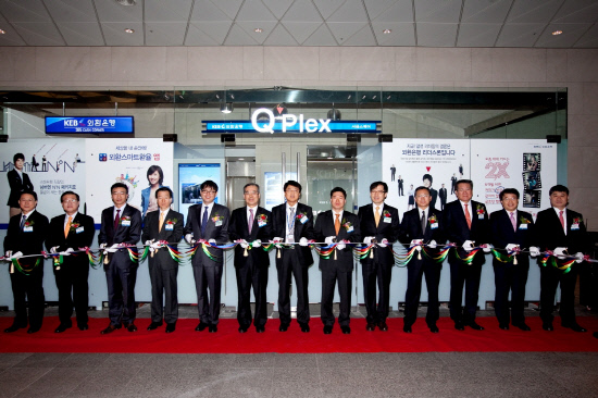 ◇11일 오전 서울 중구 남대문로 서울 스퀘어 빌딩 1층에서 열린 외환은행 『Q' Plex 서울 스퀘어점』개점식에 참석한 최임걸 외환은행 개인사업그룹 부행장(사진 왼쪽에서 여섯번째)과 박상준 SK 텔레콤 신사업추진단장(사진 왼쪽에서 다섯번째)이 참석한 내외빈과 함께 개점 축하 테입을 커팅하고 있다.