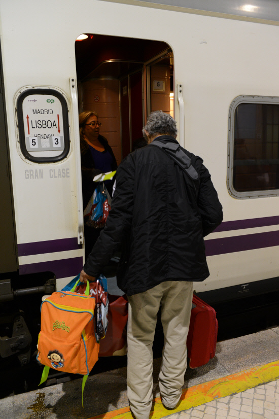| 포르투갈 리스본에서 스페인 마드리드로 향하는 야간열차에 승객이 오르고 있다. |