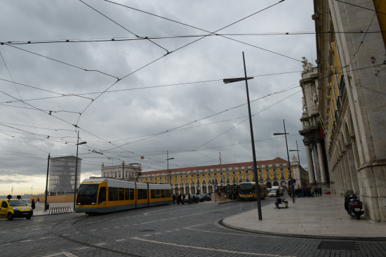 | 코메르시우 광장 앞을 전차가 지나고 있다.. |