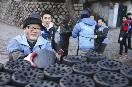 | 17일 이순우 은행장이 서울시 정릉에서 차량진입이 어려운 가정에 연탄배달 봉사활동을 하고 있다. |