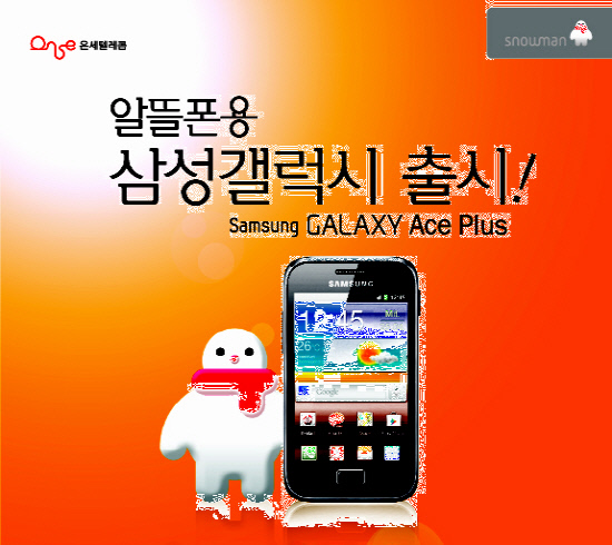 온세텔레콤은 내년 1월까지 오픈마켓 옥션(www.auction.co.kr)에서 스노우맨이 제공하는 갤럭시 Ace Plus를 구입한 고객전원에게 옥션 e-money 3만원을 지급하는 '삼성 갤럭시 Ace Plus 특별기획전'을 진행중이다. 가입 시 월 3만8000원에 음성통화 200분, SMS 350건, 데이터 500MB(WiFi는 무료)를 기본 제공하는 '알뜰스마트38'을 선택하면 약정기간 동안 무료통화 월 30분, 무료SMS 월 50건을 추가로 제공한다. 2만원 상당의 가입비, 유심비, 배송비도 면제다.