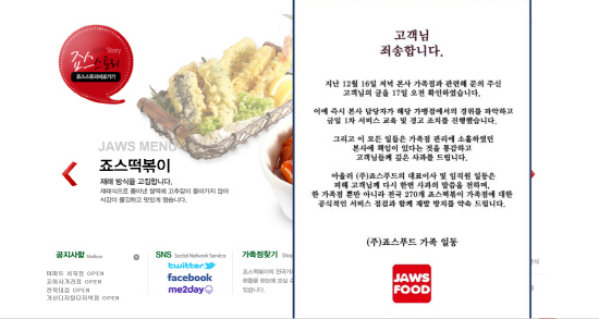 한편 죠스떡볶이 측은 페이스북, 트위터 등 SNS 채널 및 공식 홈페이지를 통해 "본사 담당자가 해당 가맹점에 경위를 파악하고 1차 서비스 교육 및 경고 조치를 진행했다"며 "가족점 관리에 소홀했던 본사에 책임이 있다는 것을 통감하고 고객님들께 깊은 사과를 드린다"고 사과문을 올렸다.