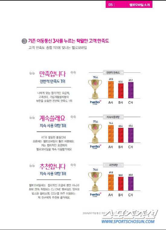 CJ헬로비전(대표 변동식)의 이동통신서비스 '헬로모바일'(hello mobile)이 전반적인 서비스 만족도, 고객의 지속 사용 및 추천 의향 면에서 기존 이동통신사보다 만족도가 높다는 조사결과가 나왔다.