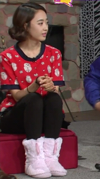 이날 김민정은 그녀의 뽀얀 피부를 돋보이게 하는 레드 컬러 상의에 깜찍한 핑크 컬러 베드룸 하우스 부츠를 신고 귀여운 그녀만의 동안 패션으로 시청자의 눈길을 끌었다.