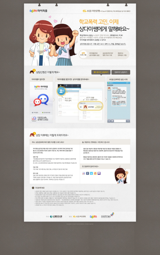 25,000명의 마플 친구들이 상다미쌤을 찾아 마음의 문을 열었고, 6명의 학생들이 집중 치료를 받는다. 다음커뮤니케이션(대표 최세훈)이 지난 8월 27일 교육과학기술부, KB국민은행, 열린의사회와의 '학교폭력 관련 학생 상담-치료지원을 위한 다자간 업무협약(MOU)'에 따라 모바일 메신저 마이피플에 오픈한 학교폭력 상담 창구의 성과다.