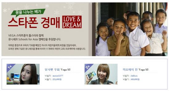 팬택이 21일부터 27일까지 베가 브랜드 사이트(www.ivega.co.kr)에서 진행된 유니세프 Schools for Asia 캠페인 기금 마련 '러브 앤 드림(LOVE & DREAM) 스타폰 경매' 행사를 통해 총 670만원의 수익금을 얻었다.
