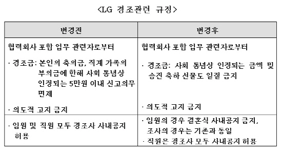 LG가 임직원들이 협력회사를 비롯한 업무 관련자로부터 경조금을 일절 받지 않도록 하는 등 경조관련 규정을 대폭 강화했다.