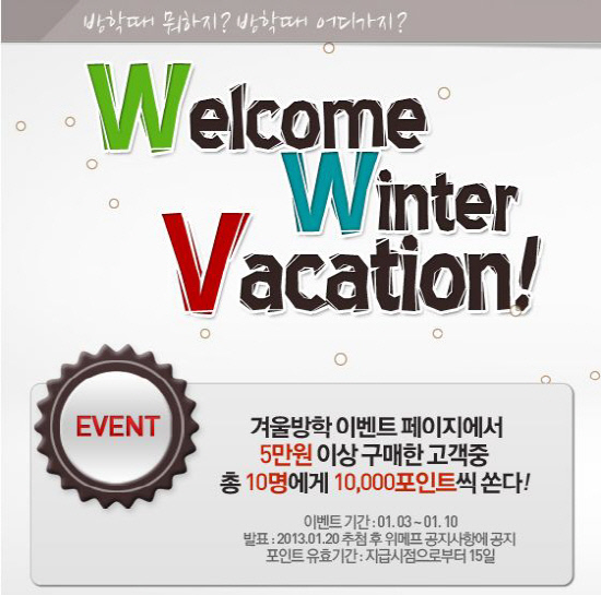 위메이크프라이스(대표 박은상·허민)가 겨울방학을 맞이해 초등학생부터 대학생까지 연령별 맞춤형 겨울방학 기획전 'Welcome Winter Vacation'을 10일까지 진행한다.