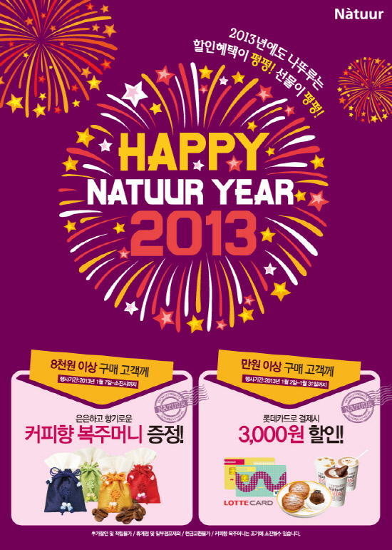 아이스크림 전문점 나뚜루(www.natuur.co.kr)가 새해를 맞아 증정 및 할인 프로모션 '해피 나뚜루 이어 2013'을 실시한다.