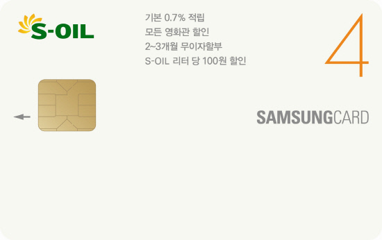 'S-OIL 삼성카드 4' 는 S-OIL에서 주유시 회당 10만 원, 월 이용금액 40만 원까지 리터당 100원 청구할인 혜택을 제공한다.