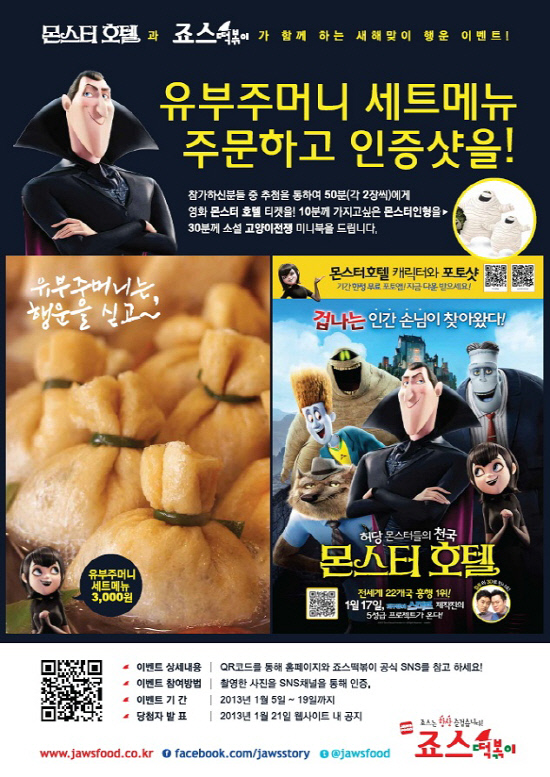 이벤트에 참여한 고객에게는 추첨을 통해 50명에게 3D 애니메이션 영화 '몬스터호텔' 티켓(1인 2매), 30명에게 소설 고양이 전사들 미니북, 10명에게 '몬스터호텔'에 출연하는 캐릭터 인형을 증정한다. 당첨자는 1월 21일 죠스떡볶이 공식 홈페이지 및 페이스북과 트위터를 통해 발표될 예정이다.