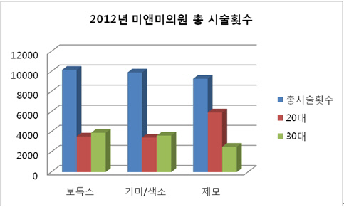 미앤미의원이 지난해 시술한 총 5만8580여 건의 쁘띠성형, 피부과 시술 중에서 보톡스가 1만3300건으로 가장 많았다. 이어 기미, 색소 관련 레이저 시술이 9,425건으로 2위를 차지했으며 제모 시술은 9,203건었다.