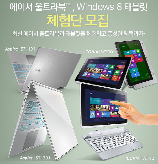 에이서가 울트라북 및 태블릿 4종 제품의 체험단을 모집한다. 체험단에게는 제품 무상증정, 할인권 증정 등 푸짐한 혜택이 제공된다. 체험 이벤트에 제공되는 제품은 에이서 울트라북 '아스파이어 S7-391' 및 '아스파이어 S7-191'과 에이서 태블릿 '아이코니아 탭 W510' 및 '아이코니아 탭 W700' 총 4종이다. 체험단 신청은 1월 15일부터 20일까지 6일간 가격비교 사이트 다나와의 이벤트 페이지(http://event.danawa.com)를 통해 진행되며, 모델 별로 각 3명씩 총 12명이 선정된다.