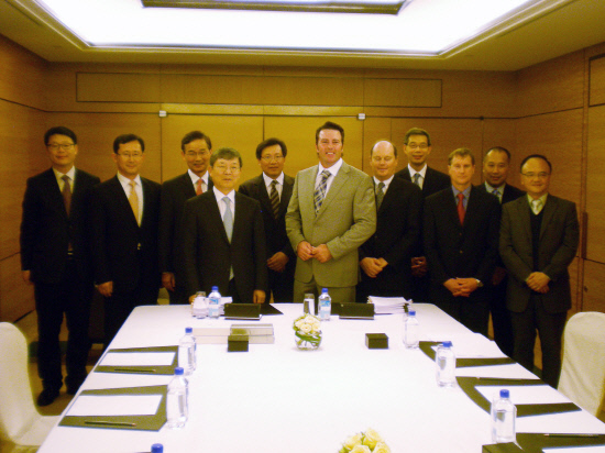 | ◇현대중공업 이재성 사장(왼쪽 네 번째)과 시스판사 공동 CEO인 게리왕(Mr. Gerry Wang, 왼쪽 다섯 번째), 카일 워싱턴(Mr. Kyle Washington, 왼쪽 여섯 번째) 등 양사 관계자들이 계약서명 후 기념촬영하고 있다. |