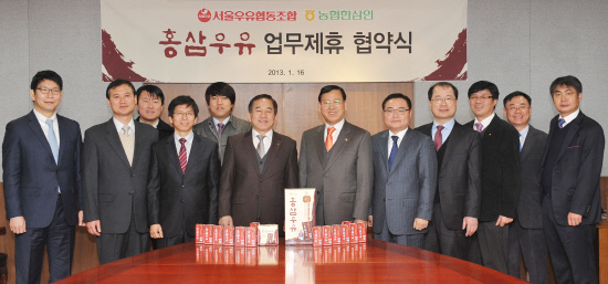 서울우유협동조합(조합장 송용헌, www.seoulmilk.co.kr)은 홍삼우유의 개발과 성공적인 출시를 위해 농협한삼인(대표 이준태, www.hansamin.com)과 16일 업무협약을 체결했다고 밝혔다.