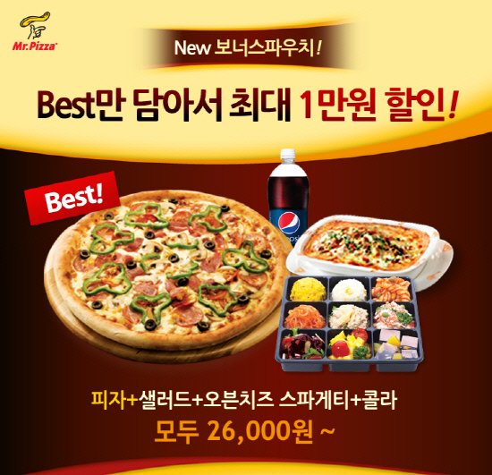 MPK그룹의 피자업계 베스트브랜드인 미스터피자(대표이사 문영주, www.mrpizza.co.kr)는 '다독이피자'와 '홈샐러드' 등 미스터피자의 인기메뉴로 구성된 세트메뉴 '보너스파우치'를 새롭게 선보인다.