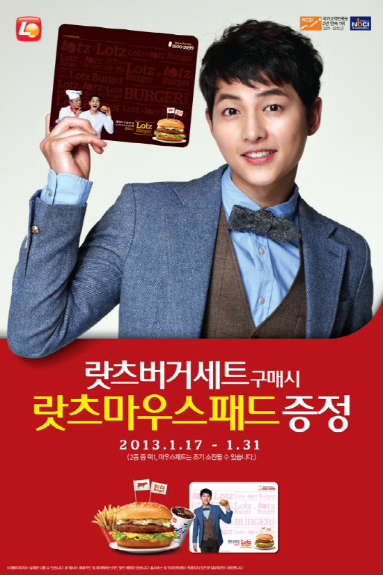 이번 프로모션은 1월17일부터 31일까지 진행되며, 랏츠버거 세트메뉴를 구매하는 고객에게 2013년 핫 아이콘이자 롯데리아 광고모델인 송중기가 프린트된 랏츠 마우스 패드를 증정한다.