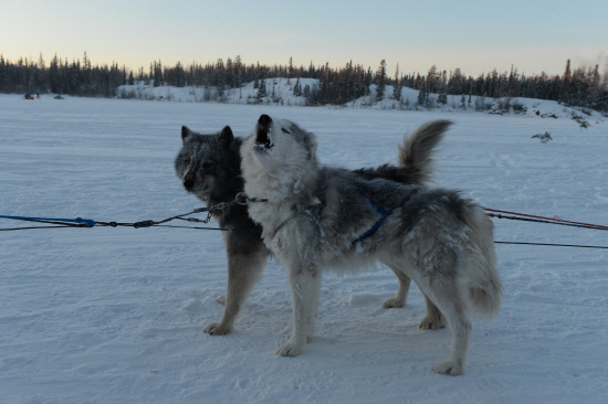 | ◇썰매 끌기 대기 중인 시베리안 허스키. 영하 20~30도의 혹한에서 최고의 컨디션을 발휘한다. |