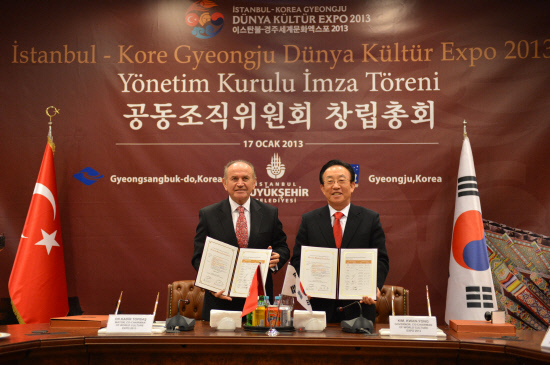 지난 17일(한국시각 18일) 터키 이스탄불시청에서는'이스탄불-경주세계문화엑스포2013' 공동조직위원회 창립총회가 열렸다. 이날 총회에서는 김관용 경북도지사와 카디르 톱바쉬 이스탄불 시장이 나란히 공동조직위원장에 위촉돼, 세계적 문화이벤트의 성공 개최를 다짐했다.
