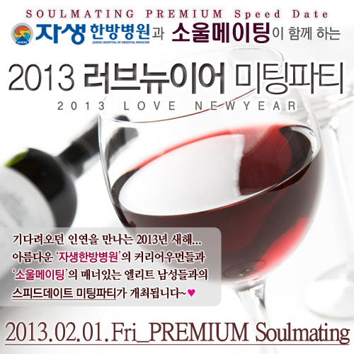스피드데이트 서비스 소울메이팅이 2013년 새해를 맞아 자생한방병원 싱글여성과 함께 하는 '2013 러브뉴이어' 미팅파티를 개최한다. 자생한방병원의 GWP(Great Work Place) 향상을 위해 마련된 미팅파티는 2월 1일, 압구정의 프리미엄 뷔페 '드마리스'에서 개최되며, 자생한방병원의 커리어우먼들과 소울메이팅의 엘리트 남성회원 12쌍(24명)을 대상으로 진행된다.