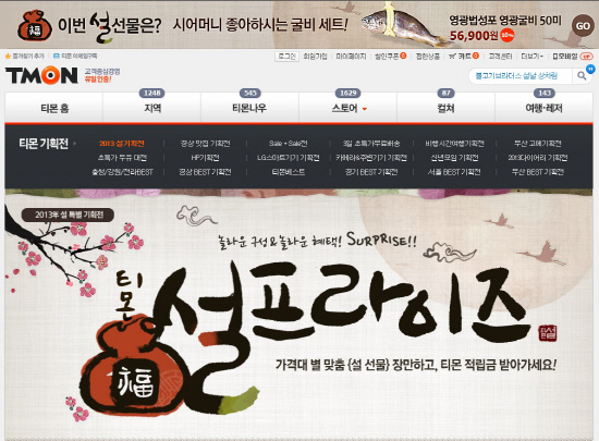 티켓몬스터(대표 신현성)가 운영하는 대한민국 대표 소셜커머스 티몬(www.tmon.co.kr)은 민족 대명절 설날을 앞두고 가격대별 맞춤 설 선물과 함께 적립금을 제공하는 '설프라이즈' 기획전을 오는 3일까지 진행한다고 22일 밝혔다.