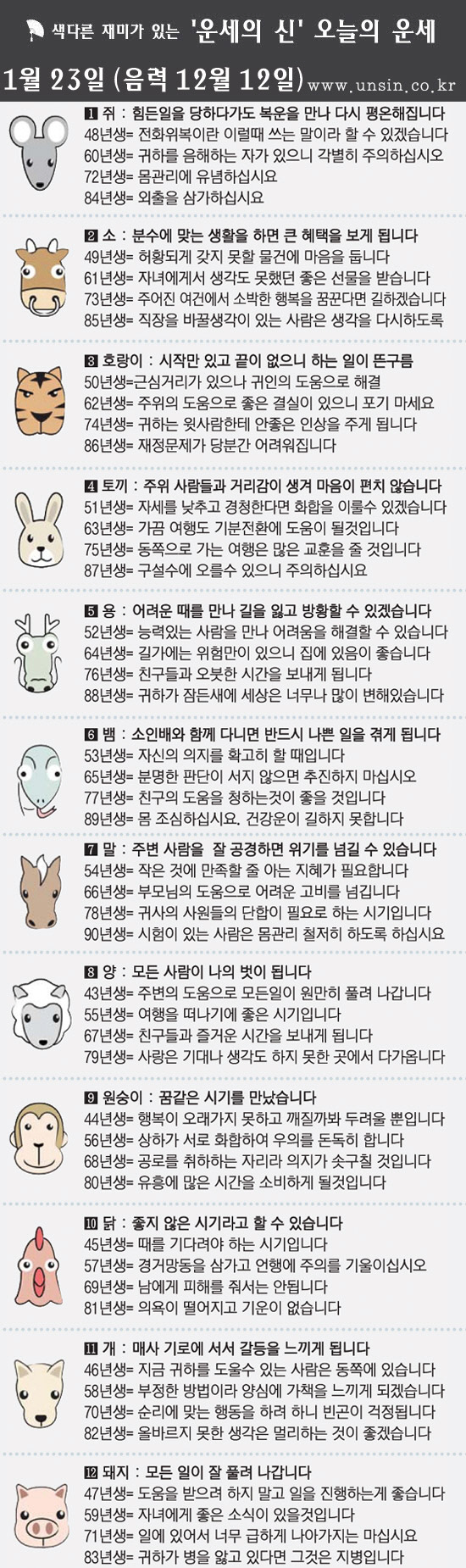 [띠별 오늘의 운세] 2013년 1월 23일 수요일(음력 12월 12일)