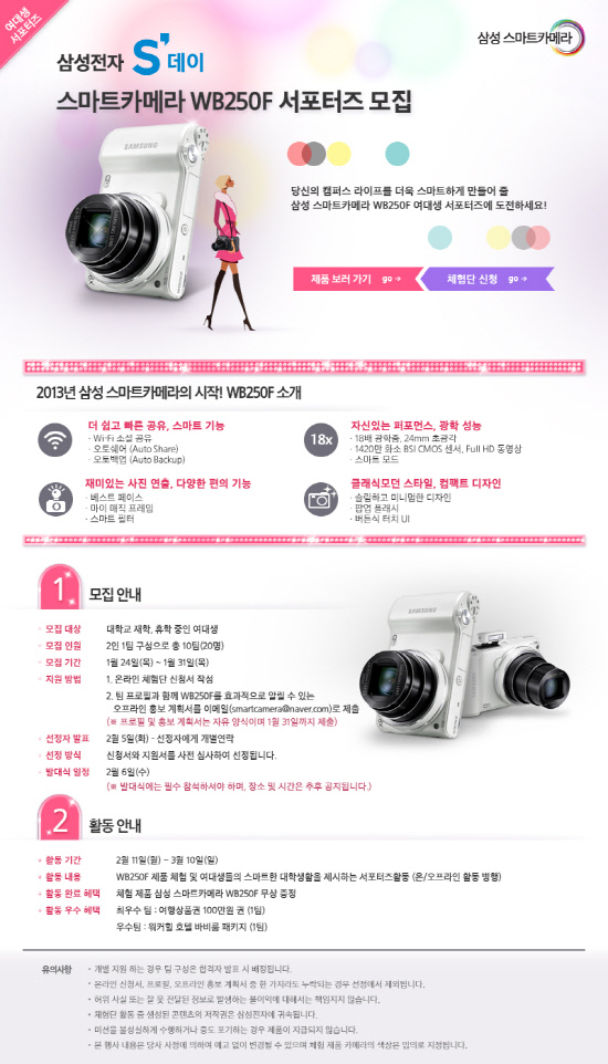 삼성전자가 2013년 첫 스마트카메라 WB250F의 '여대생 서포터즈' 10팀(2인1팀)을 24일부터 31일까지 모집한다. 여대생 서포터즈는 더 쉽고 편리하게 사진 공유와 전송이 가능한 스마트카메라 WB250F를 활용해 캠퍼스 스타일링, 캠퍼스 라이프 팁, 캠퍼스 드림 등의 주제로 스마트한 대학 생활의 TIP을 알리는 미션을 수행하게 된다.