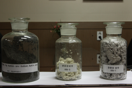 특히 (주)에코글로벌테크(www.ecoinfra.co.kr)는 석탄재의 응용과 사출, 연화, 탈수, 건조과정을 거쳐 광물섬유를 제조하는 기술 및 장치, 무기성 잔류물질을 선별하는 원심분리형 채거름기를 이용해 15mm 이상의 섬유를 추출하는 장치와 4가지 원재료를 성형상태에서 믹싱하는 혼합기, 용해로에서 발생되는 폐열을 이용한 평면 브랑켓 방식의 펠트형 건조장치 등을 출원시켜 기술에 접목시키고 있다.