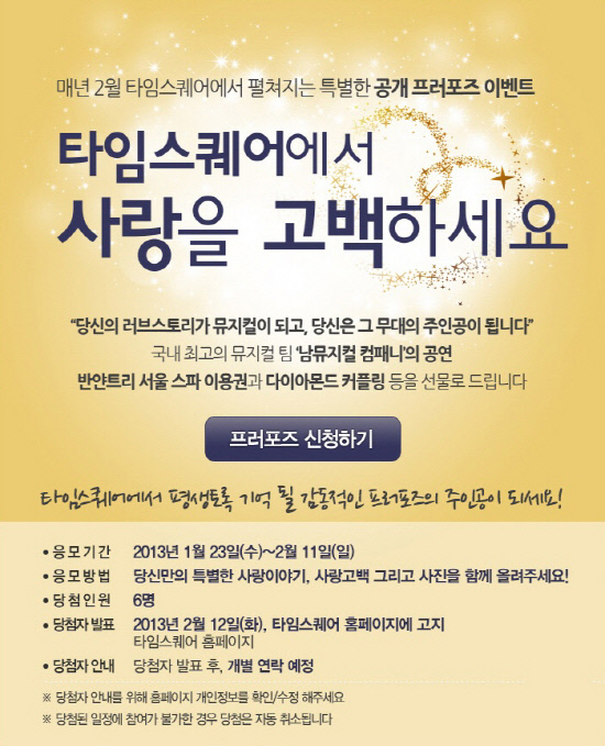 뮤지컬 갈라쇼 중 주인공 커플의 깜짝 프러포즈 이벤트가 진행되며, 타임스퀘어 제공하는 70만원 상당의 '다이아몬드 커플링'을 교환하며 서로의 사랑을 고백하는 시간을 갖는다. 이어 축가공연 후 커플들의 힘찬 행진으로 프러포즈 이벤트의 클라이막스를 연출한다. 행사 종료 후 주인공 커플은 타임스퀘어 방문 고객들과 함께 기념사진을 촬영하는 시간을 가진다.