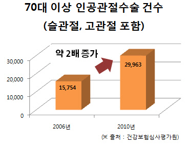 고관절 인공관절수술도 역시 크게 증가했다. 2010년 70대의 고관절치환술 수술 건수는 2006년보다 약 163% 증가했으며, 80대 고관절 인공관절수술도 약 148% 늘었다.