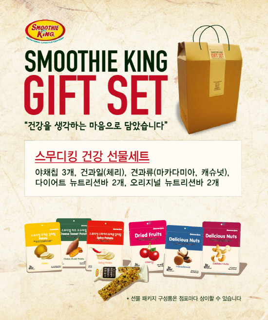 먼저, '스무디킹 기프트 세트'(2만원)는 야채칩 3종, 건과일·견과류 3종, 뉴트리션바 4종으로 알차게 구성된 건강 간식 패키지로, 경제적인 가격에 맛과 영양까지 담은 것이 특징이다. 특히 세트 구성품을 각 제품군 안에서 원하는 품목으로 선택해 바꿀 수 있어, 받는 사람의 취향에 따라 맞춤식 선물이 가능하다.