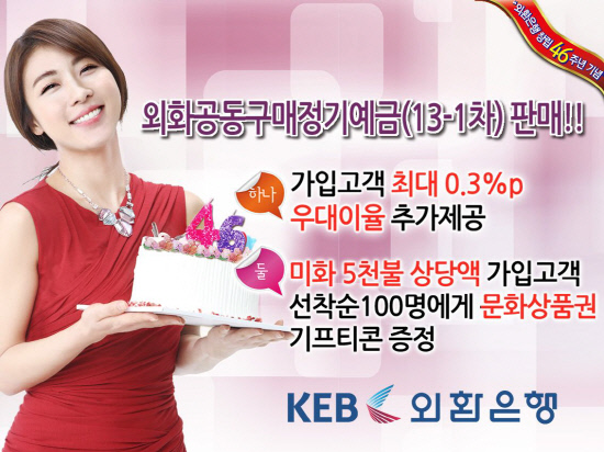 외환은행(은행장 윤용로/www.keb.co.kr)은 창립 46주년을 기념하여 1월30일부터 3월 6일까지 '외화공동구매정기예금(13-1차)'을 판매한다고 28일 밝혔다.
