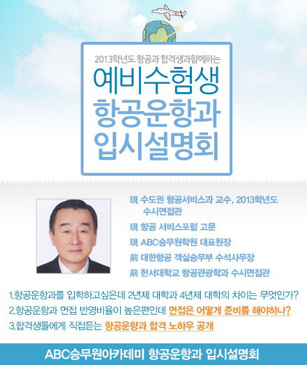 이러한 궁금증을 풀어주는 시간을 ABC승무원학원에서 2.2일 (토) 1시에 항공운항과 입시설명회라는 주제로 학부모님 및 학생들과 함께한다. 설명회는 現 수도권 항공서비스과 교수 前 대한항공 수석사무장, 한서대학교 항공관광학과 면접관으로 활동한 김정훈 원장이 직접 설명회를 진행하며 설명회참석은 ABC승무원학원 홈페이지(www.abccrew.co.kr)를 통해 선착순 30명까지 접수가능하며 전화로도 가능하다.