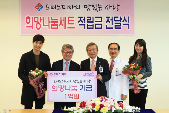 피자배달 기업 도미노피자(www.dominos.co.kr)가 29일 서울대학교 어린이병원 환아 지원을 위한 '희망나눔기금' 1억원을 전달하고, 도미노피자 CF 모델 수지, 정일우와 함께 '희망나눔 피자파티'를 진행했다.