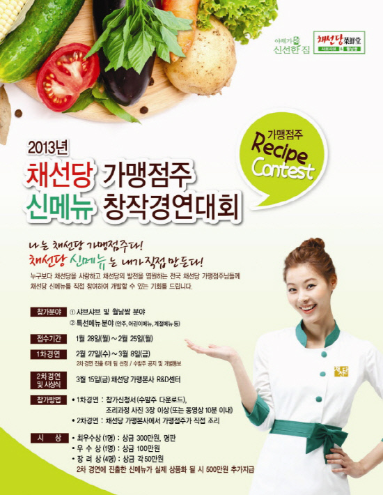 특히 채선당은 서울, 경기 지역을 비롯해 전라도, 경상도, 충청도, 강원도 등 전국 각지의 지역별 특산물을 활용해 지역의 고유한 특색과 조화를 이루는 참신하고 다양한 가맹점주표 레시피들이 선보여질 것으로 예상하고 있다. 또 '2013년 채선당 가맹점 신메뉴 창작 경연대회'를 통해 선정된 메뉴가 출시될 경우, 해당 가맹점주의 이름과 가맹점명을 메뉴판에 표기하여 매장을 찾는 고객에게 적극 홍보할 계획이다.