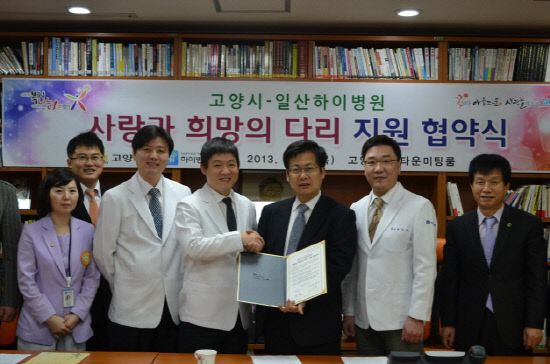 | 일산하이병원(병원장 김영호·왼쪽에서 네번째)과 경기도 고양시청(시장 최성·오른쪽에서 세번째)이 지난 31일 '사랑과 희망의 다리지원, 척추·관절 무료수술' 협약식을 가졌다. |