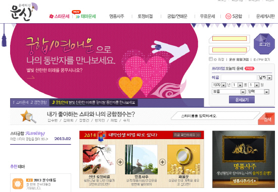 2013년 토정비결, 사주, 궁합과 연애운은 물론 남녀간의 속궁합, 셀러리맨을 위한 직장인 운세, 심심풀이로 보는 스타운세 등 사이트가 선보이는 메뉴가 전부 해당한다.