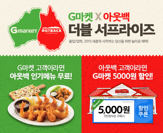 국내 최대 전자상거래 사이트 지마켓(www.gmarket.co.kr)과 외식 1위 브랜드 아웃백이 제휴를 맺고 2월 한달 동안 아웃백 메뉴 무료쿠폰, 지마켓 할인쿠폰 증정 등 다양한 혜택을 담은 '더블 서프라이즈' 프로모션을 진행한다.