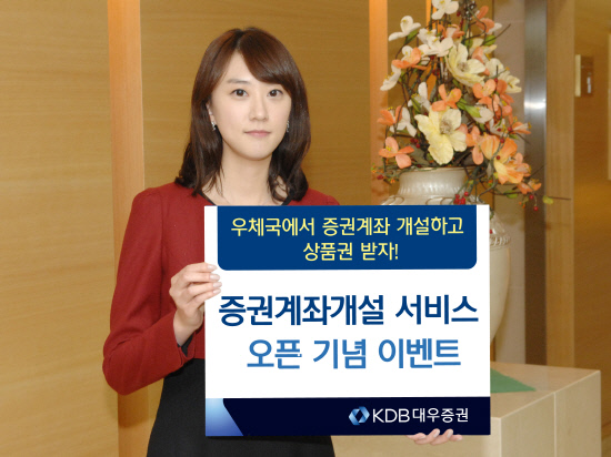 KDB대우증권(사장 김기범)이 4일, 우체국과 업무제휴를 맺고 '증권계좌개설 서비스 오픈 기념' 이벤트를 실시한다.