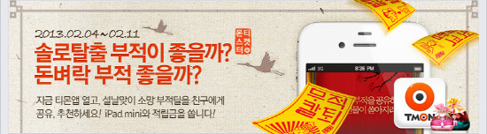 티켓몬스터가 운영하는 소셜커머스 티몬(www.tmon.co.kr)이 설을 맞아 4일부터 2월 11일까지 '소망부적 0원딜 공유·추천 이벤트'를 실시한다.