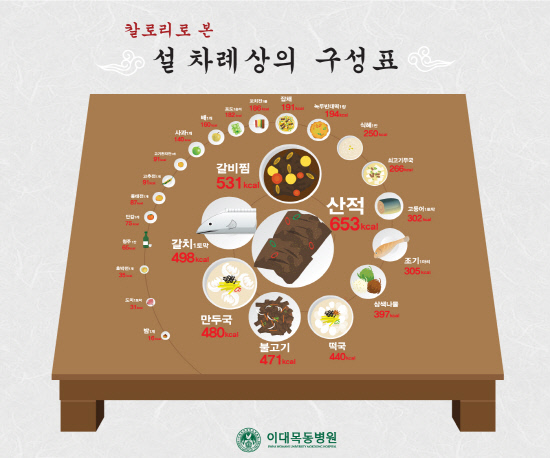 이에 이대목동병원 심장혈관센터는 설 음식별 칼로리 양을 이미지로 확인할 수 있는 '설 차례상의 재구성표'를 발표했다. 표는 칼로리량에 따라 설음식을 분류함으로써 칼로리 조절이 필요한 사람들의 이해를 돕기 위해 만들어졌다.