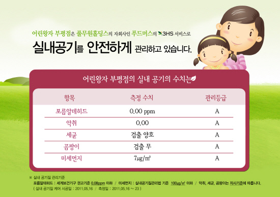 살균시스템은 주방에도 설치되어 식중독을 예방하고 있다. 샘플조사한 부평점과 강남점의 경우에는 공기질 측정 결과 올 A급 판정을 받기도 했다.