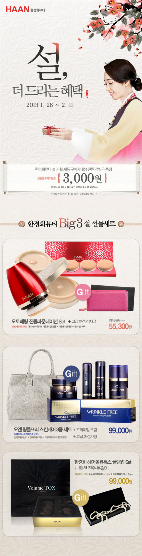 오는 11일까지 한경희뷰티 홈페이지(www.HAANbeauty.com)에서 판매되는 '빅 3 설 선물세트'는 한경희 진동파운데이션의 시즌3 제품인 '오토 패팅 진동파운데이션'과 '오앤 링클 프리', '헤어 볼륨 톡스 글램 업' 총 3가지의 베스트셀러 제품과 특별한 선물로 구성됐다.