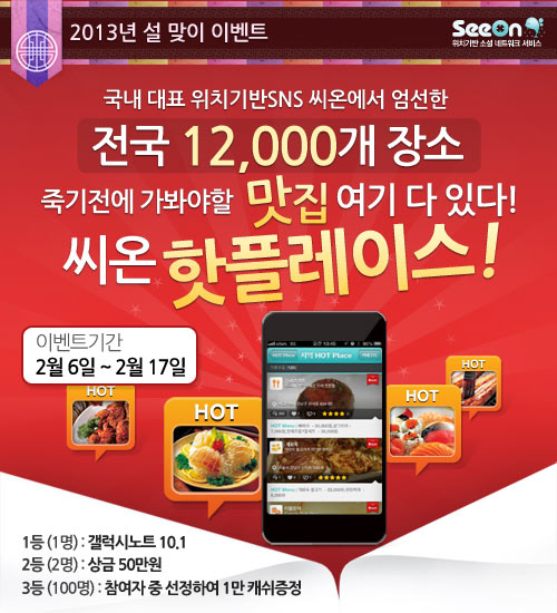 선정을 통해 1등에게 갤럭시노트 10.1을, 2등에게 세뱃돈 50만원을, 3등 100명에게는 1만원 상당의 씨온 캐쉬를 증정한다. 씨온 캐쉬는 씨온 앱 내 쇼핑몰인 '캐쉬몰'에서 현금처럼 사용할 수 있다. 스토리를 많이 올리거나 내용을 알차게 작성할 경우 당첨 확률이 높아진다. 단, 해당 장소의 인증 사진이 아닐 경우 경품 선정에서 제외된다.