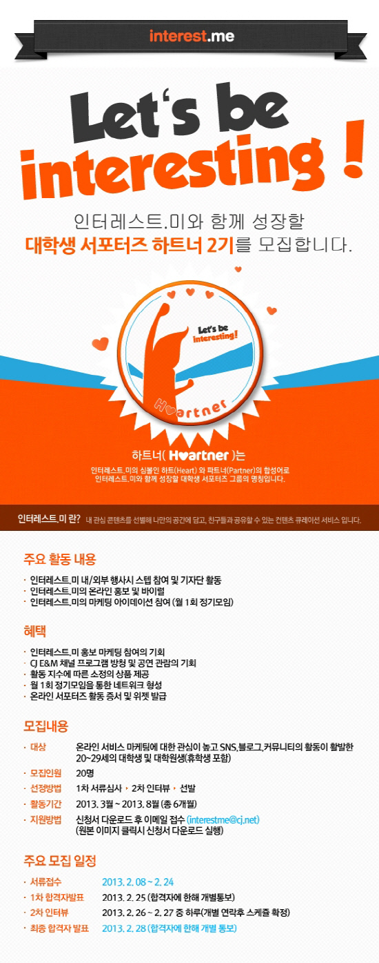 CJ E&M 온라인사업본부는 콘텐츠 큐레이션 서비스 '인터레스트.미' (www.interest.me)의 마케팅 파트너 그룹인 '하트너'를 모집한다. 하트너(Heartner)는 인터레스트.미의 interesting 아이콘인 '하트' (Heart)와 '파트너' (Partner)의 합성어로, 인터레스트.미의 마케팅 활동을 도와 줄 대학생 마케팅 파트너 그룹을 뜻한다. 지난 해 4분기, 1기 하트너 20명이 적극적인 활동을 펼친 데 이어 이번에 모집하는 2기가 그 역할을 이어갈 예정이다.